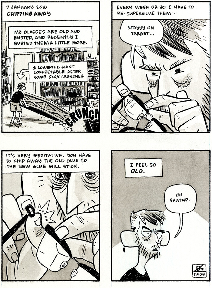 Dustin Harbin Comics|Blog|Work|Store Patreon | Instagram | TwitterInprnt | Threadless | Society6email: DUSTY[at]DHARBIN[dot]COM Home||Comics|Blog|Store| Archive|RSS||<< First|Last >>||< Previous|Next > DIARY :: January 7, 2016 :: Chipping Away Can't stick if there's old stickum still stickin.